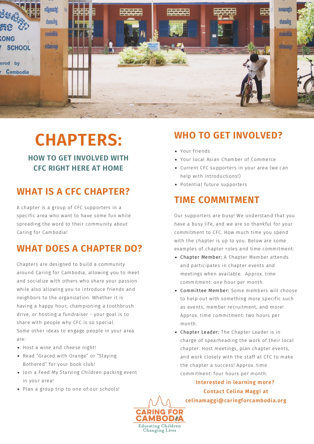 A chapter is a group of CFC supporters in a specific area who want to have some fun while spreading the word to their community about Caring for Cambodia!